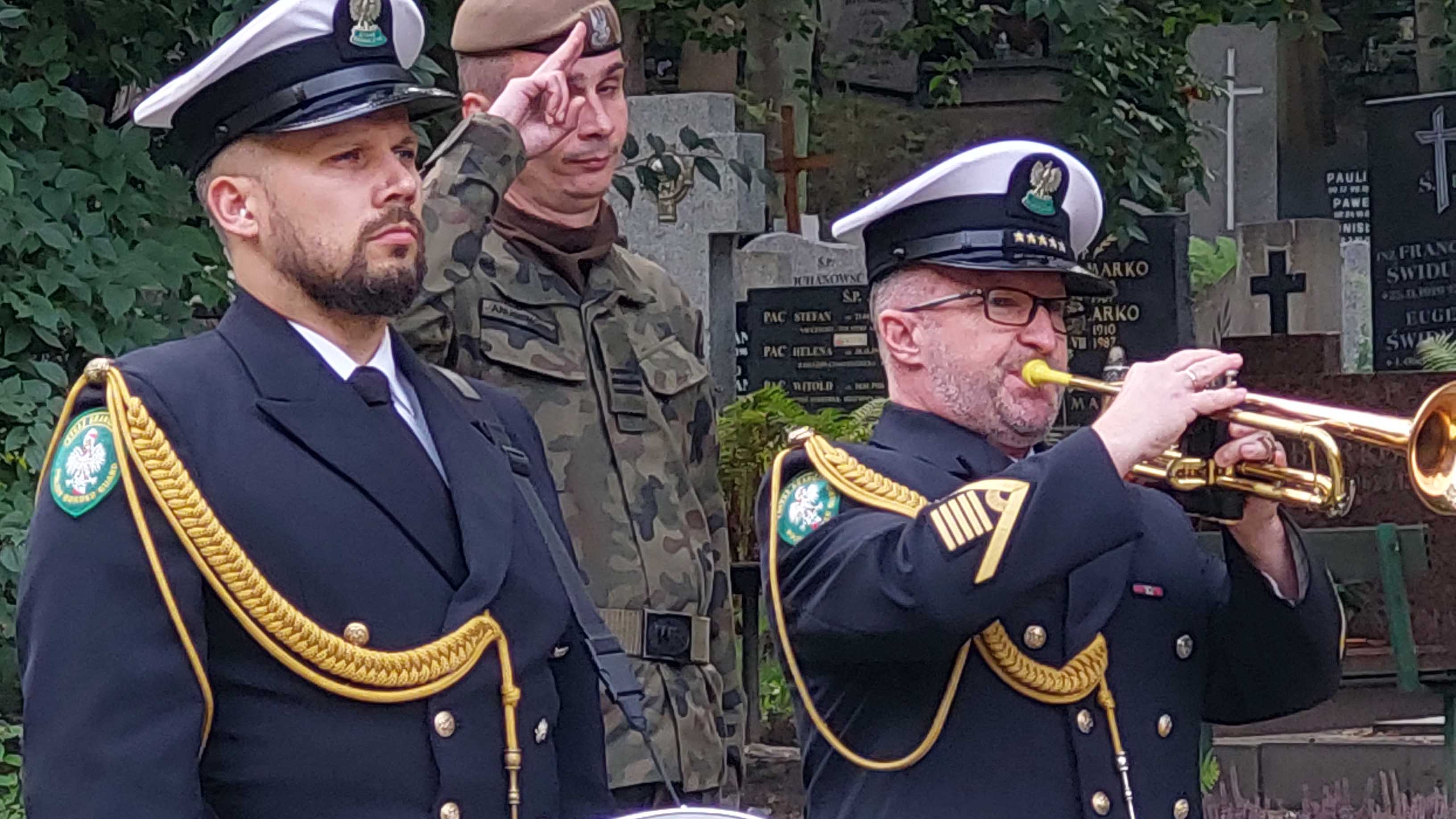 Sygnał „Śpij kolego w ciemnym grobie, Niech się Polska przyśni Tobie" gra trębacz Straży Granicznej RP