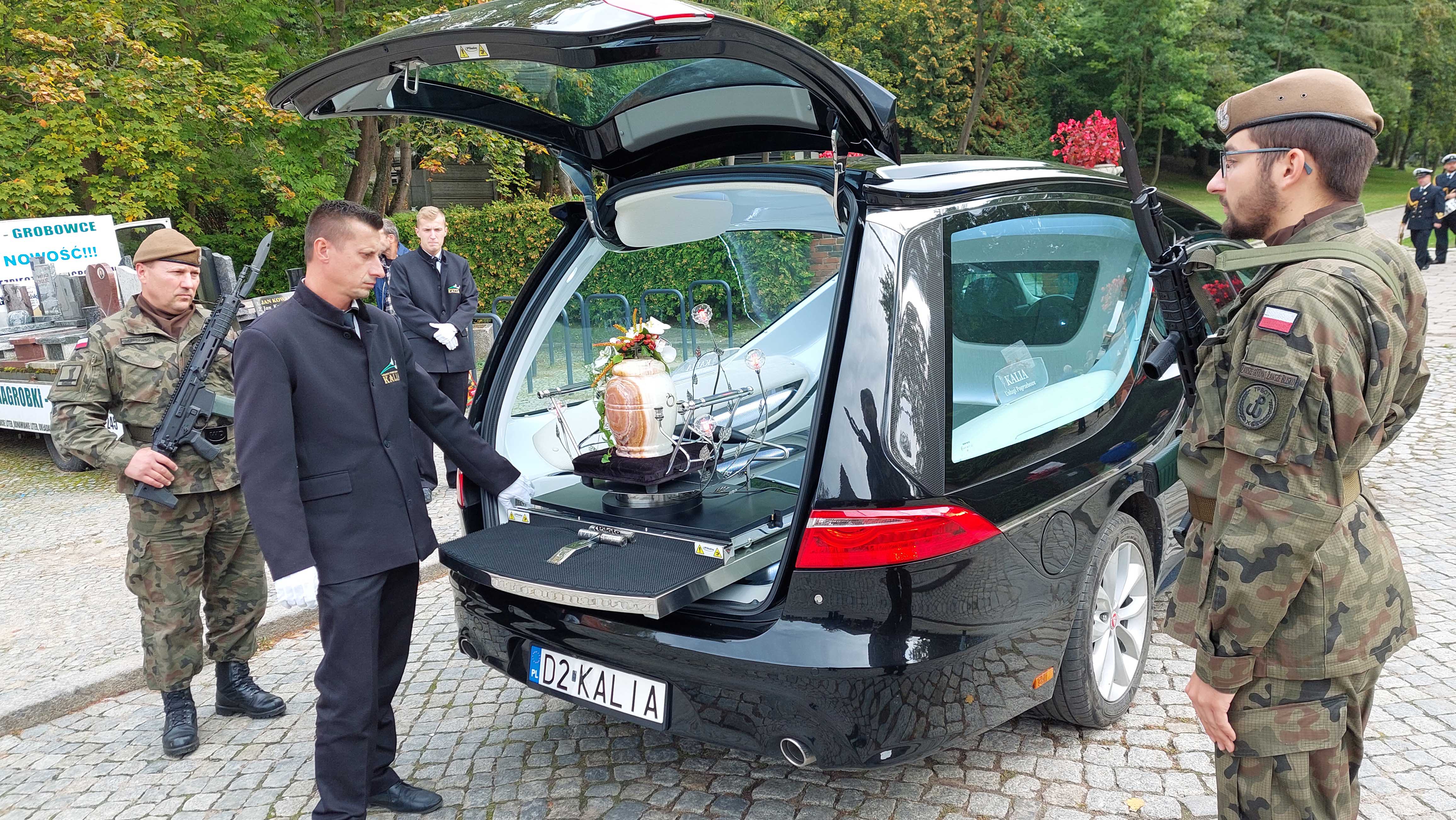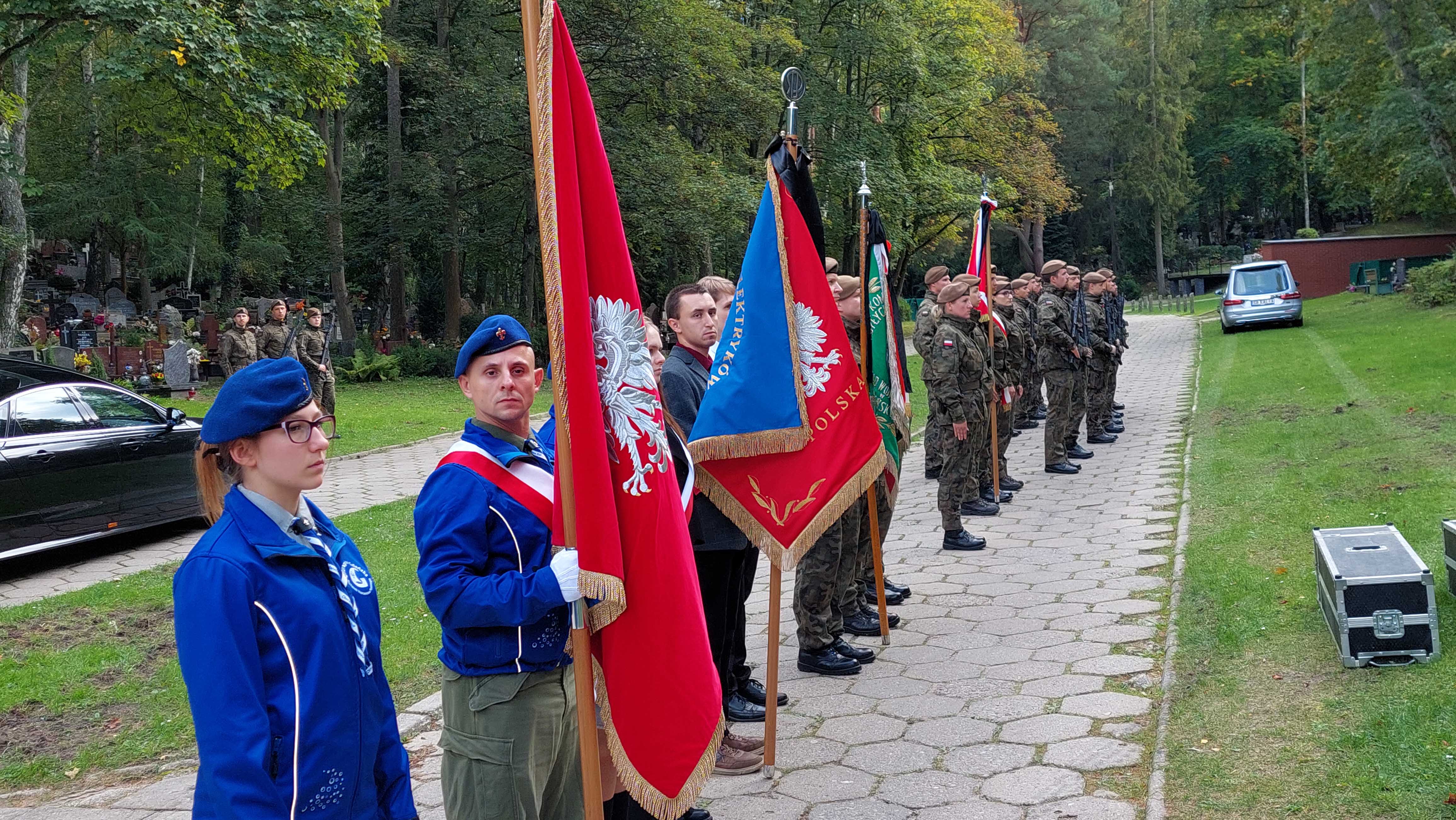 Poczty sztandarowe i kompania wojskowa w gotowości do ostatniego pożegnania