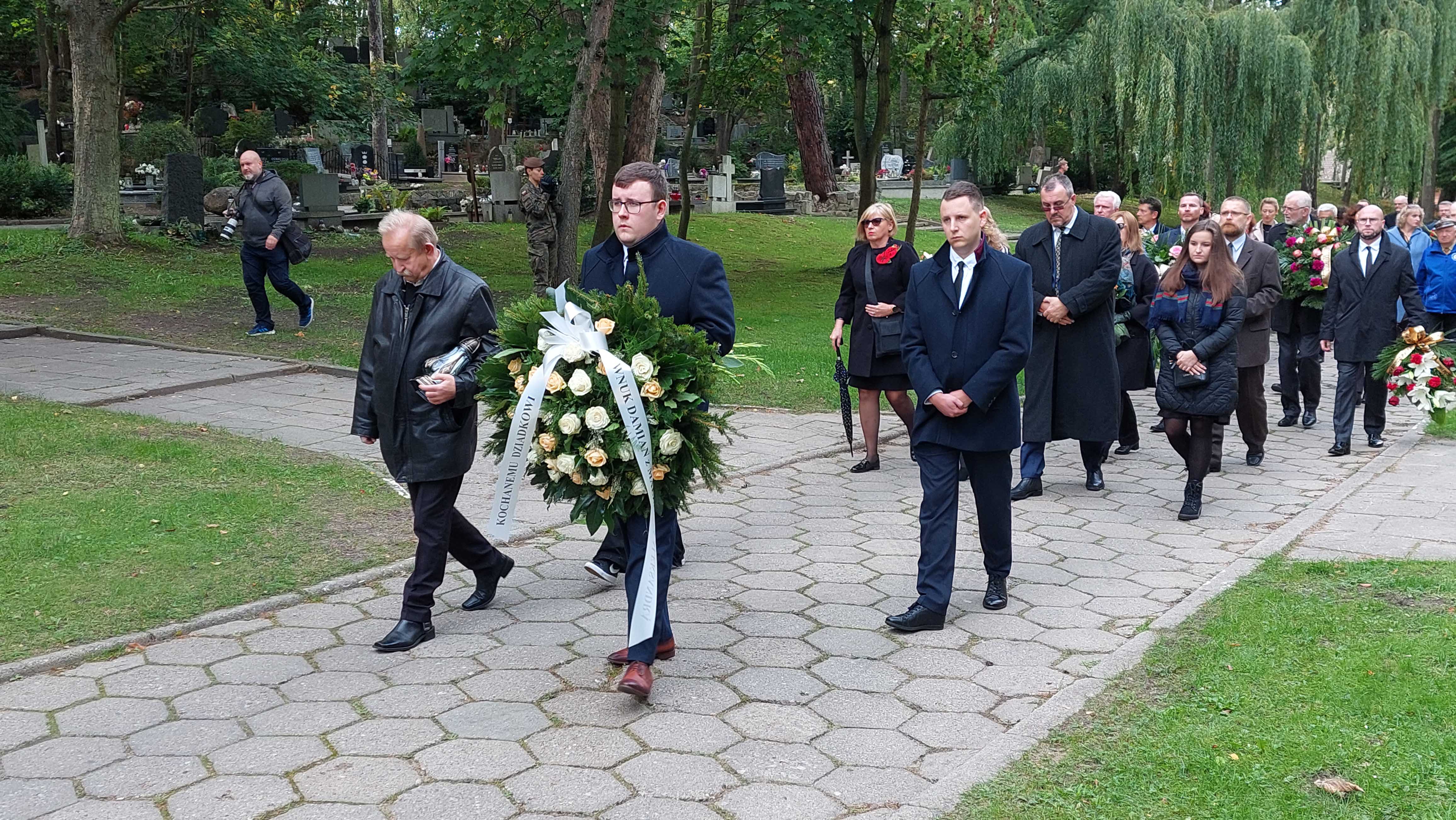 Rodzina Zmarłego w kondukcie. Wieniec niesie jeden z Wnuków Henryka Bajduszewskiego